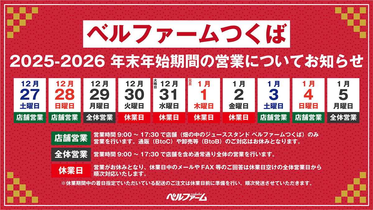休業期間:2025年12月30日(火)〜2026年1月2日(金)